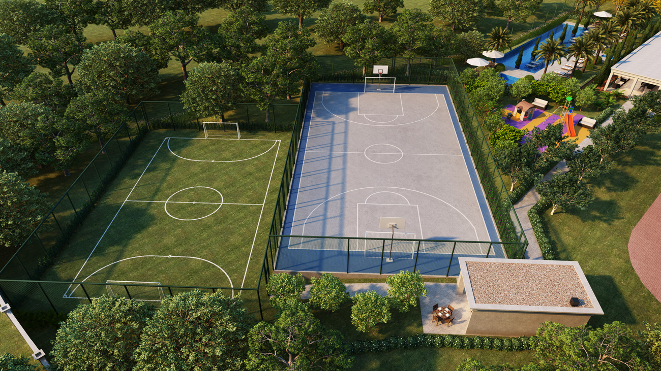 Quadra de gramando sintético e quadra poliesportiva de tênis.